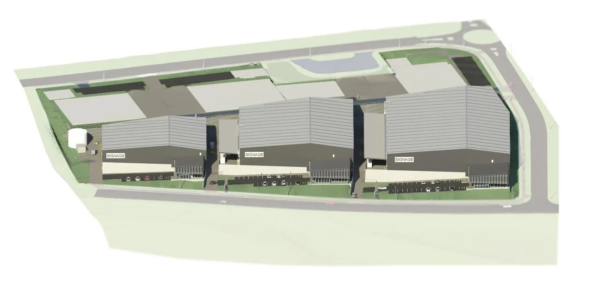 The development includes high-stud warehouses, office/showroom spaces, secure yards, and large canopies, supporting logistics and distribution operations.
